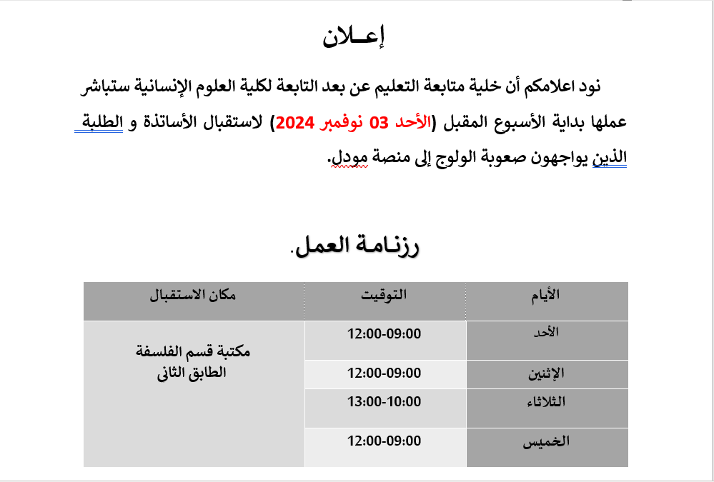 جدول توقييت اعمال موجهة السداسي الثاني 2024 2025 |
